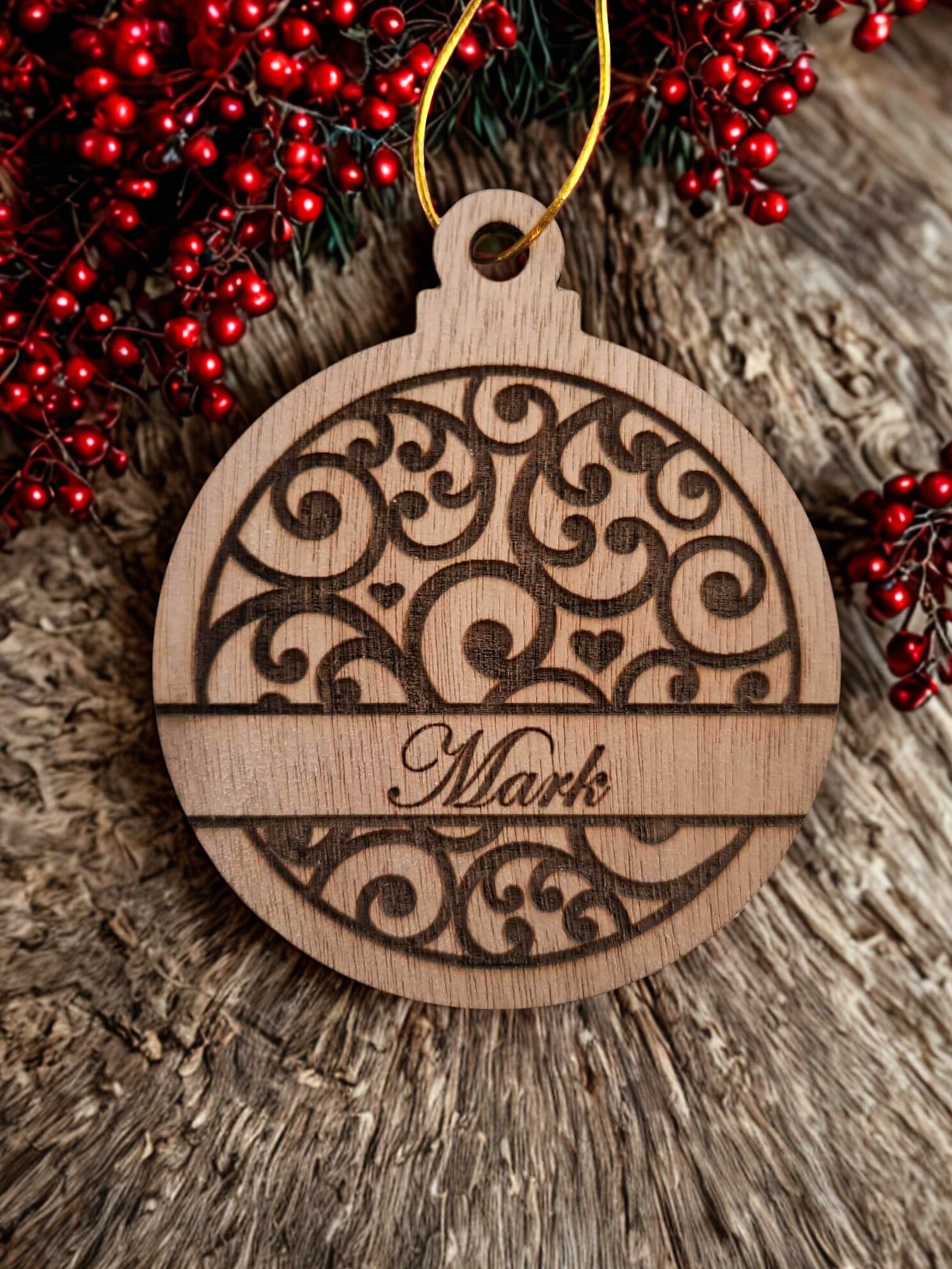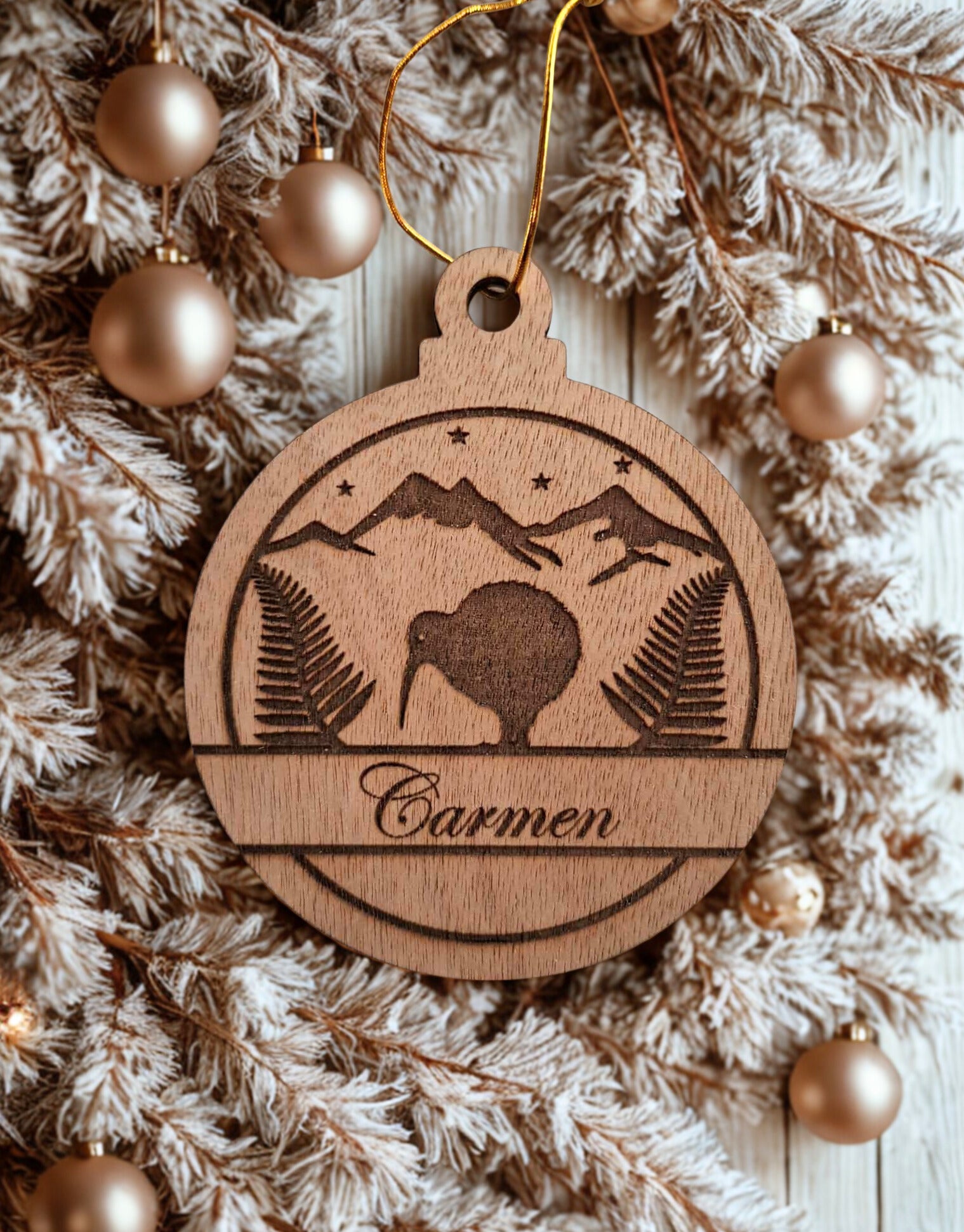 This laser cut decoration will be personalized with the name of your choice and strung with gold elastic for ease of putting on the tree, each decoration measures 85mm across. Laser cut and engraved on kadamu 4mm ply.