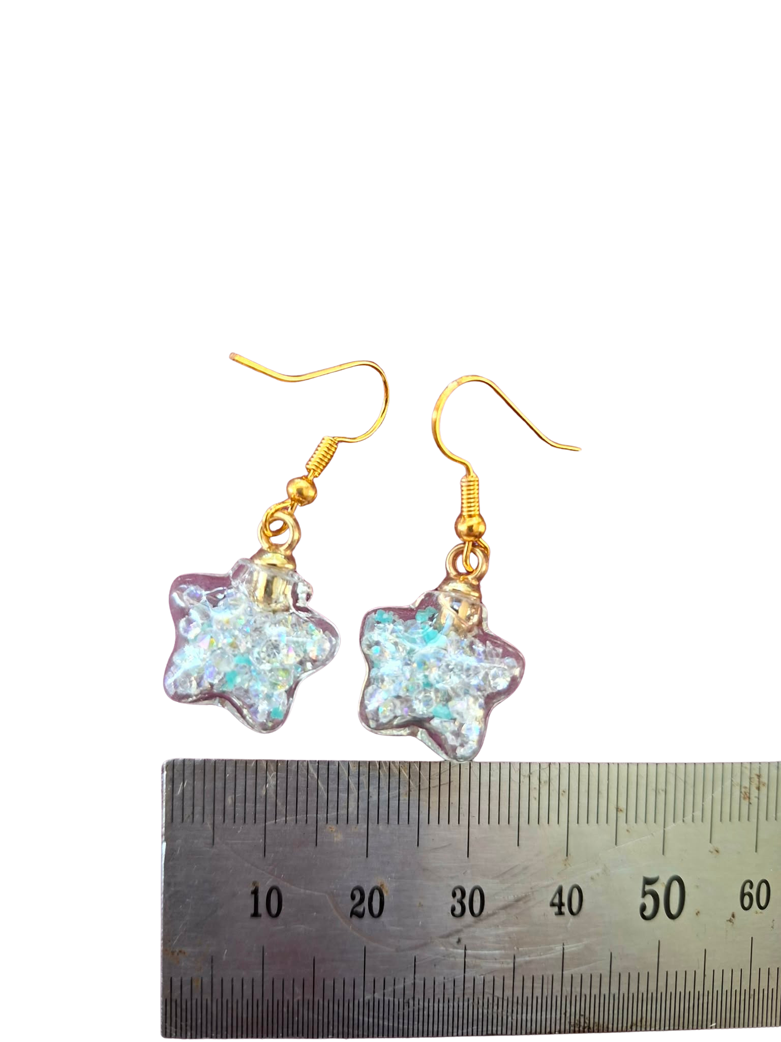 Cute clear star earrings filled with twinkling crystals that shimmer as they move. Finished with gold-tone accents and comfy hypoallergenic hooks.