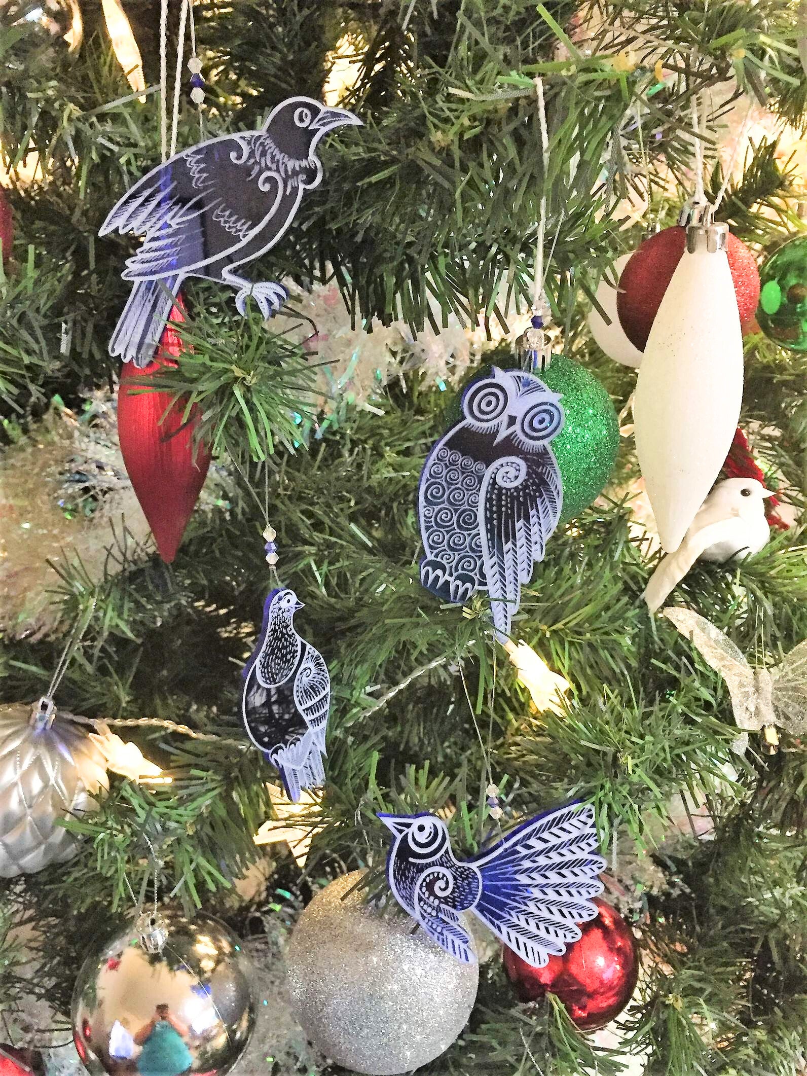 You will receive one each of Tui, Kereru (wood pigeon), Piwakawaka (fantail) and a Ruru (Morepork or owl) These can be used as Christmas decorations, sun catchers or wall art.