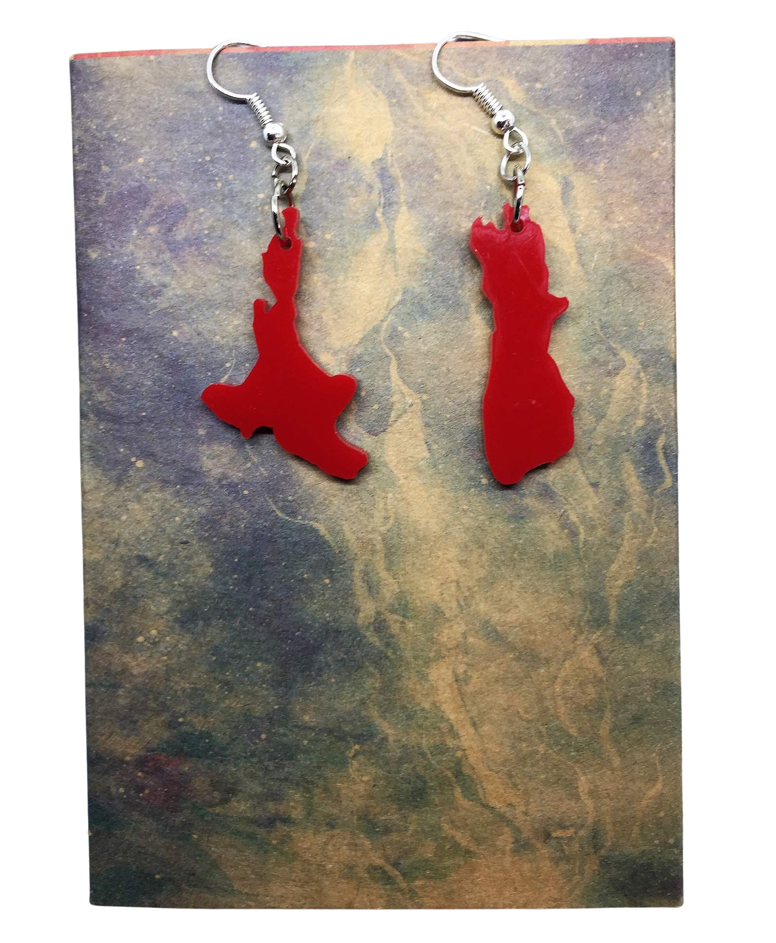 These beautiful earrings are made in NZ from laser cut acrylic, in the shape of the North and South Islands. Your earrings are on hyper allergenic silver tone hooks and will be sent in a kraft card gift box. These would be an excellent stocking stuffer or secret Santa gift for the patriot in your crowd! Available in red or black they are ready to gift or wear.