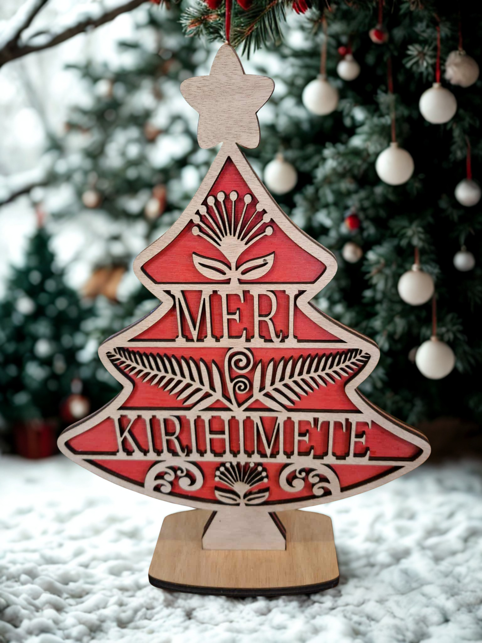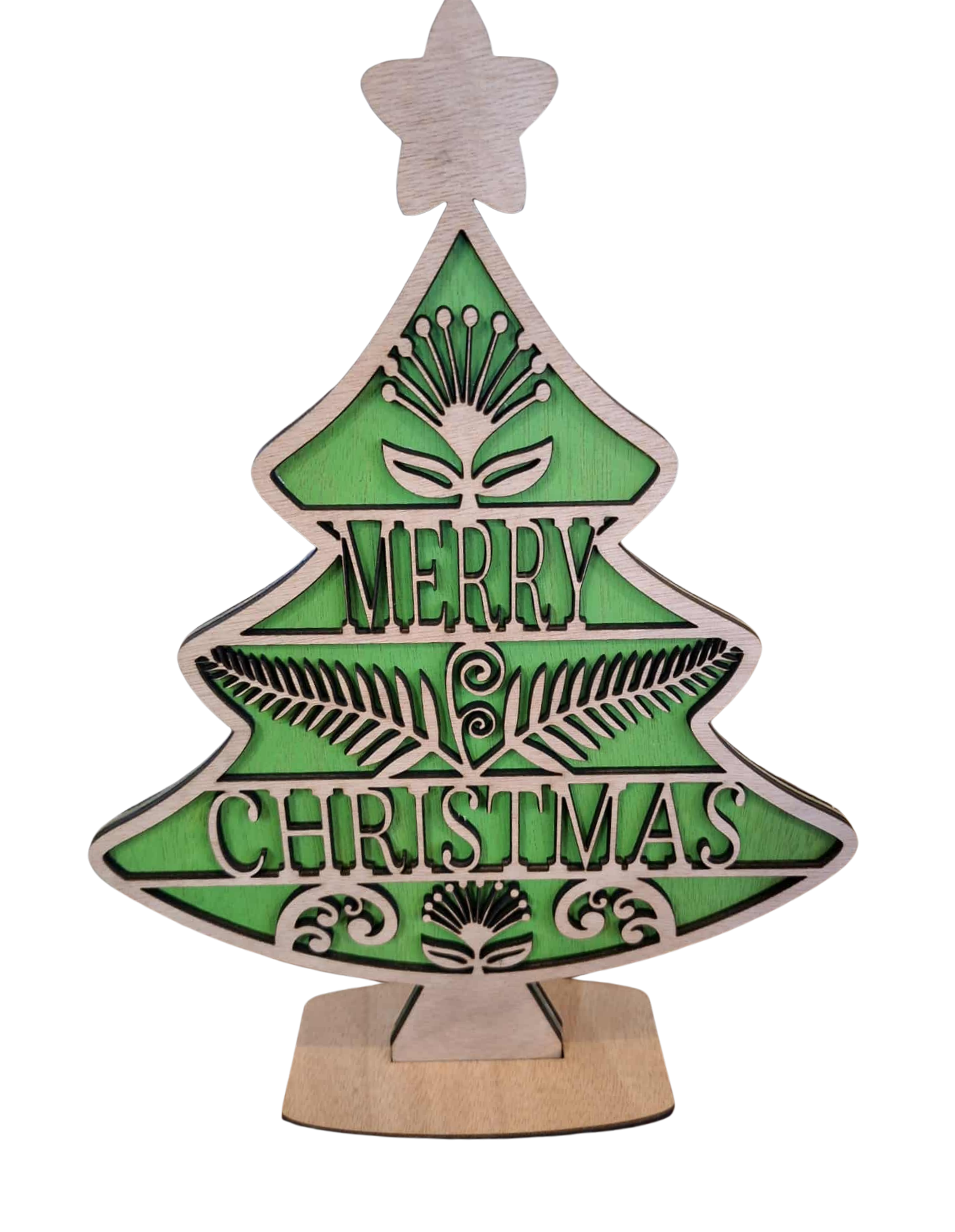 This tree has been intricately laser cut with kiwiana designs. It is double side - one side says Merry Christmas or you can turn it around to say Meri Kirihimete. This a larger sized table top tree standing 300 mm high and 220 mm wide. They are made up of three individual layers, which we have joined together and are 10mm thick. You simply need to pop the tree into its base and voila! You are good to go.