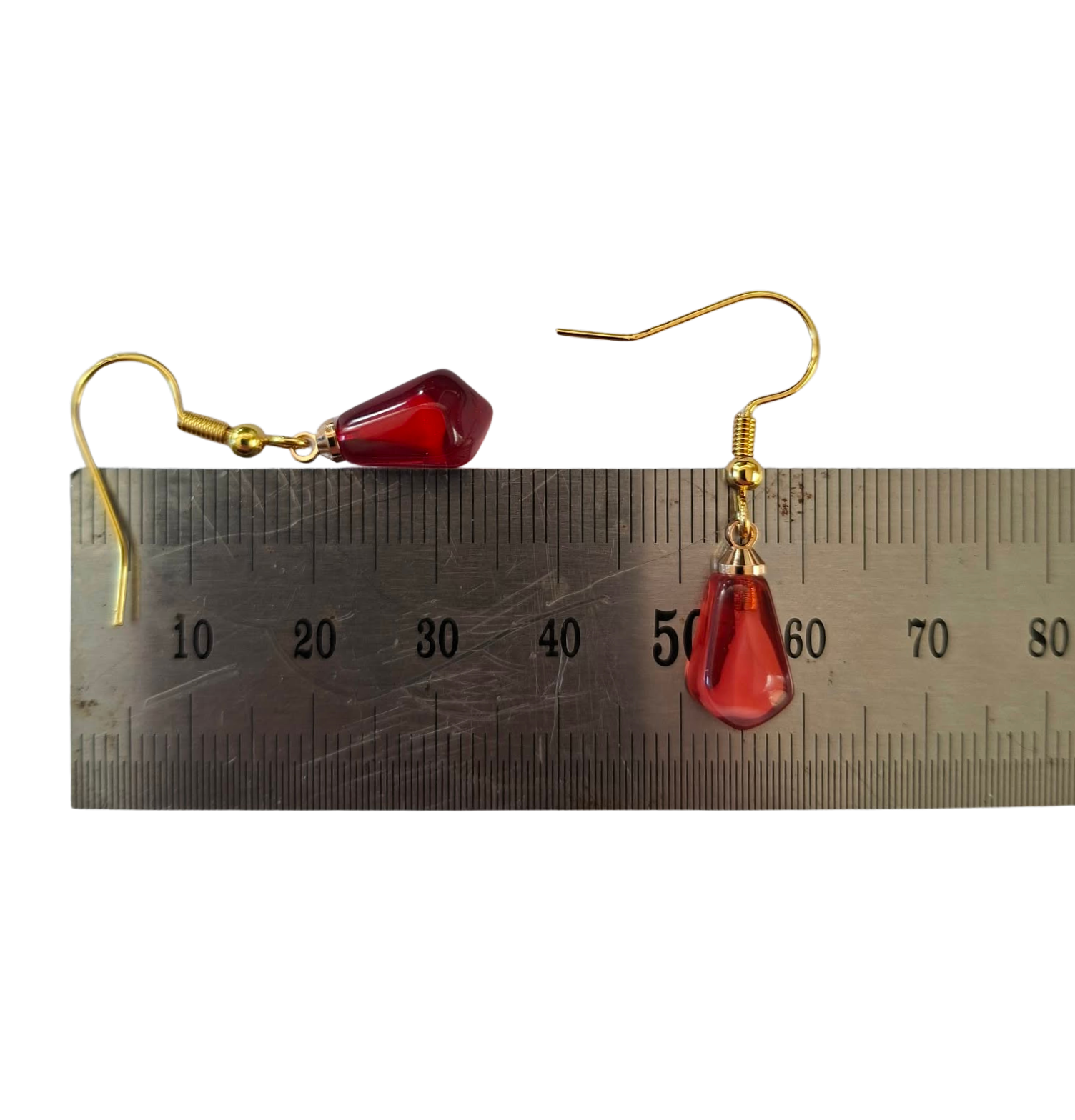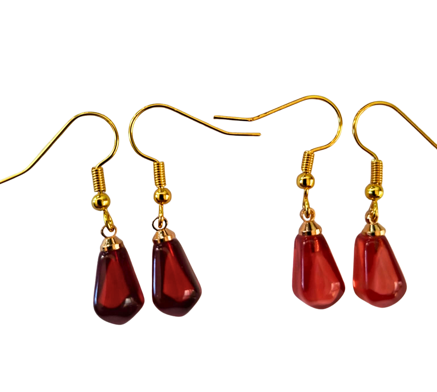 These lovely dangly earrings feature faceted resin teardrops that catch the light beautifully. Choose from deep blood red or soft pink-red, they are finished with gold-tone hypoallergenic hooks for comfortable everyday wear.
