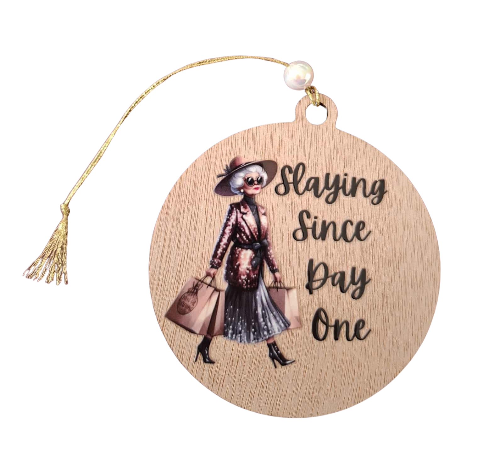 Cut from kadamu wood, we add a very high quality glossy graphic to the front than finish with a pearl style bead and metallic thread for hanging. This wee sign is 9.5 cm across and 10.5 cm long with the string. For a fun gift check out our range to find the perfect saying/picture for the women in your life!