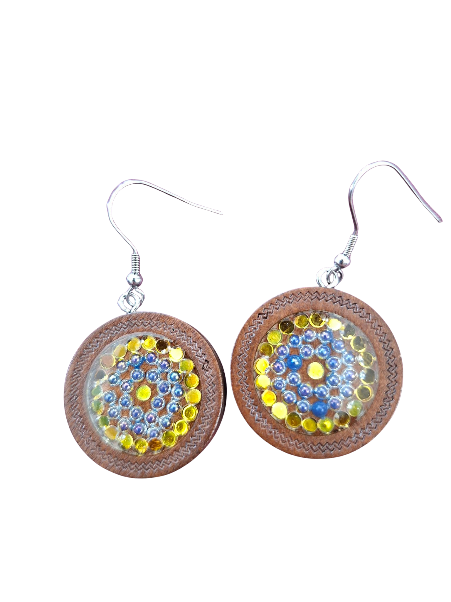 These beautiful earrings are made by hand using shimmering diamond dots, individually placed on a wooden base and finished with a glossy resin coat. They’re completed with silver-tone hypoallergenic hooks for a comfortable, stylish touch.